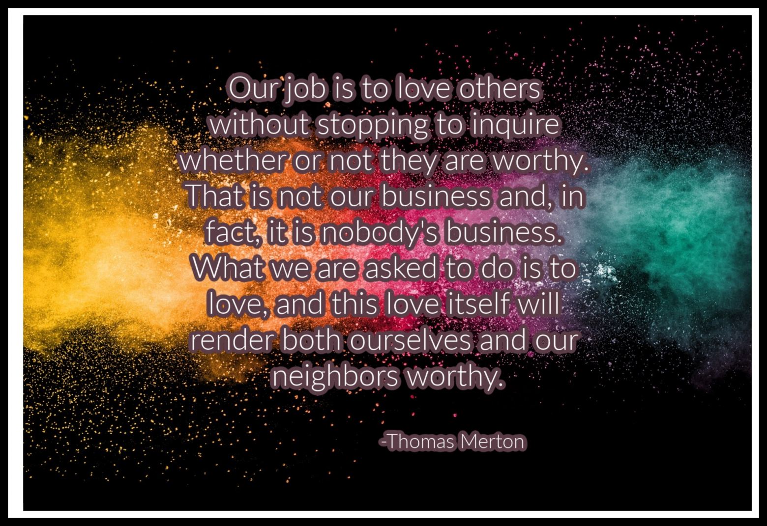If I were to expect people to love me because of how worthy I am, I would exist in a lonely universe. My closest friends love me in spite of all my shortcomings and flaws. I praise and thank God for that. It is commanded that we love our God with all of our hearts, minds and souls. That we love our neighbor as ourselves. No judgment of worth. No comparison of sin.