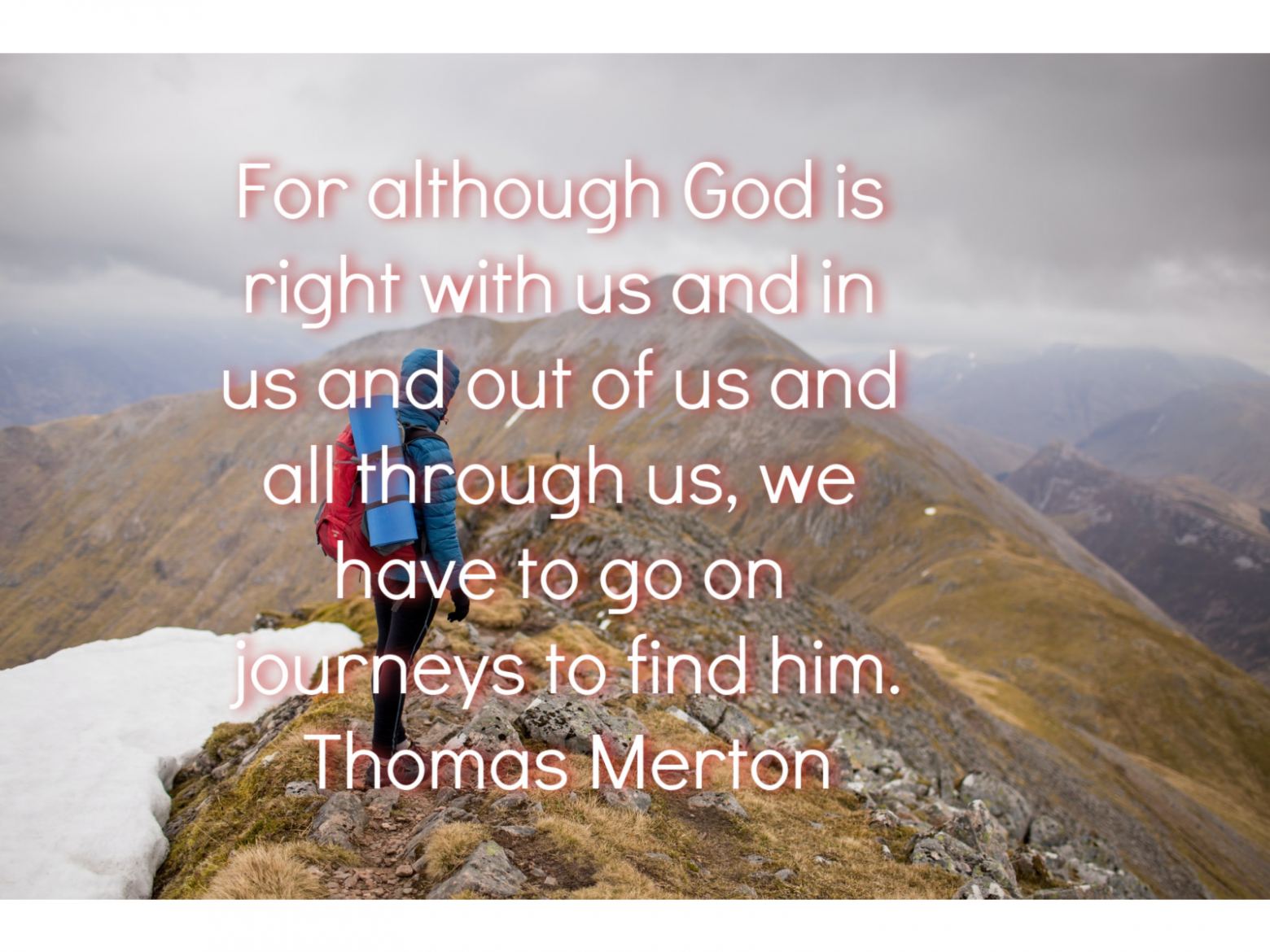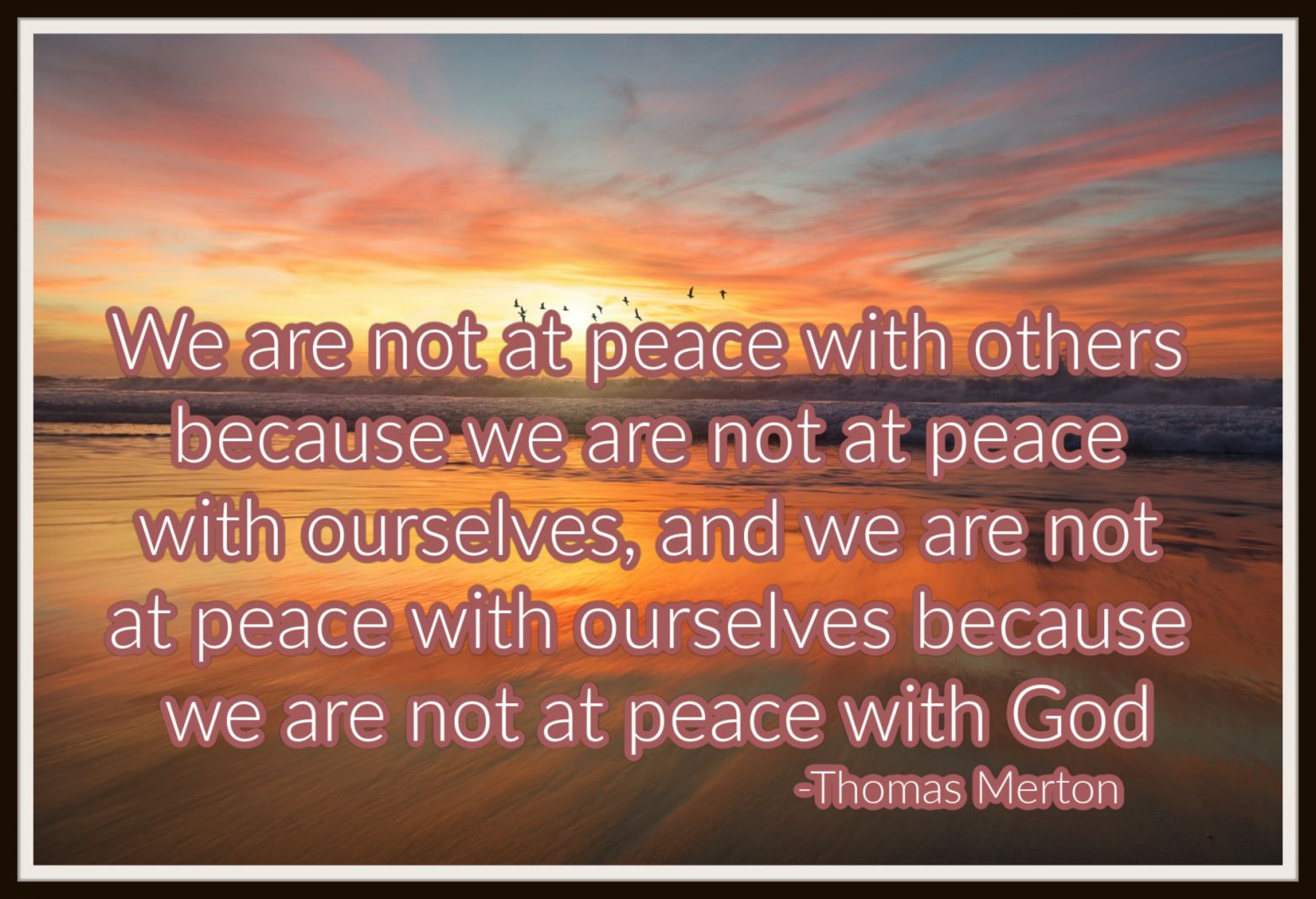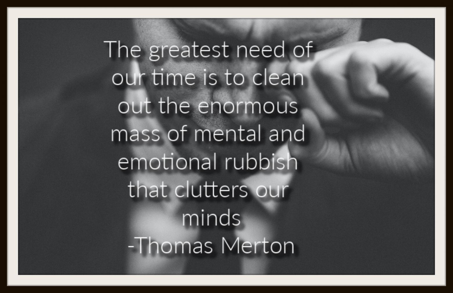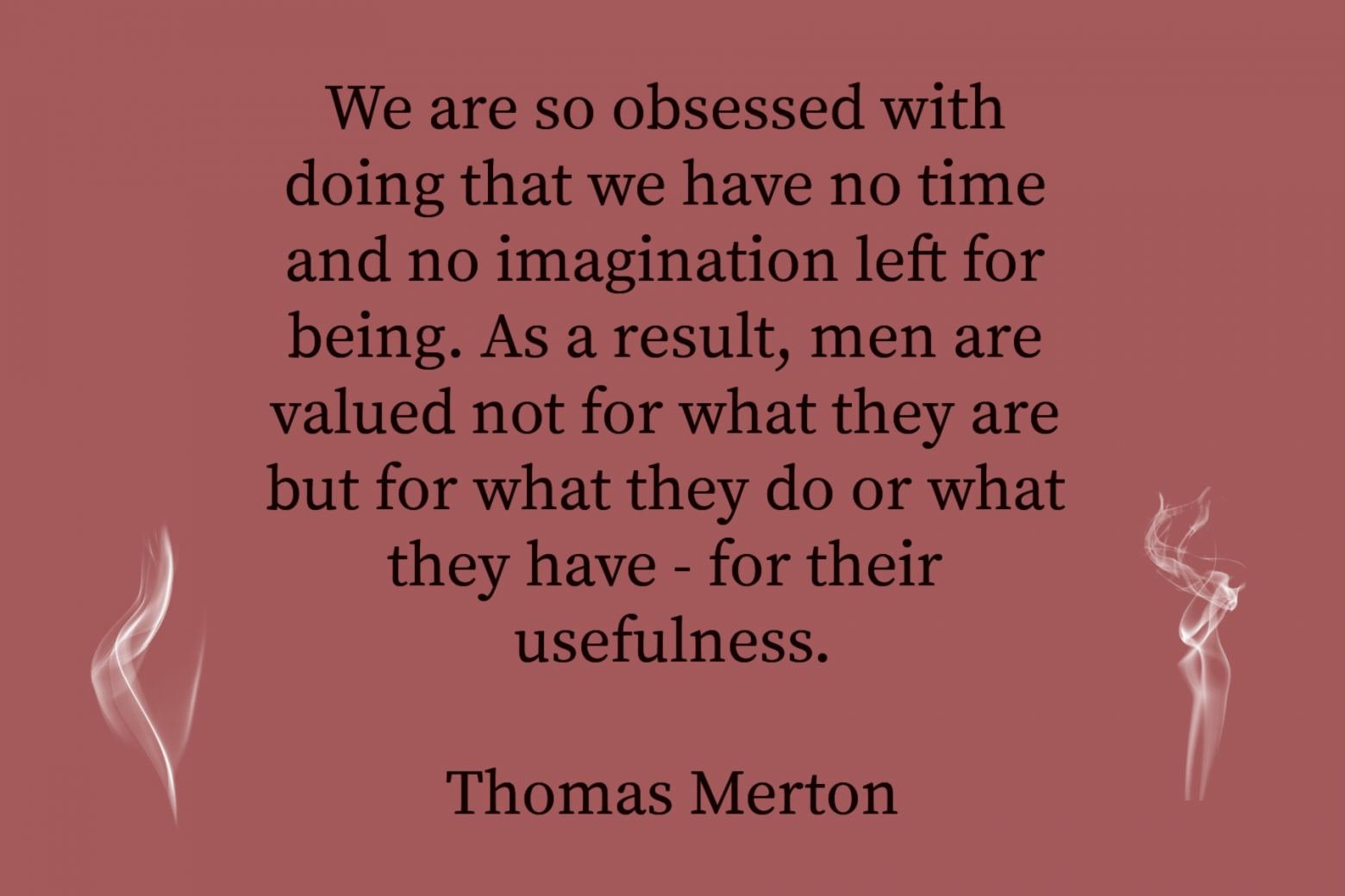 When my mind is full of conflicting thoughts, all fighting for my attention, it is very difficult to focus on God. Reading Merton helps me realize that contemplating God need not be just a “sit-down in a quiet spot practice” but more, a heartfelt moving encounter with the our loving creator that can be experienced wherever you are. So take a moment out of your “busyness of doing” and say a little prayer-a breath prayer if that is all you have time for. It will go a long way toward stilling a cluttered mind.